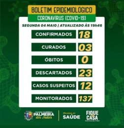 A Secretaria Municipal de Saúde (SMS) mantém atualizadas as últimas notícias sobre o coronavírus e informa que Palmeira dos Índios tem 12 casos suspeitos e 18 confirmados para a Covid-19. Nesta segunda (4), o CIEVS/AL informou que dois casos suspeitos testaram detectável (positivo) para o vírus. Além dos casos confirmados, mais cinco suspeitos foram notificados.