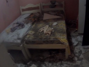 Mesmo se queixando de dores no tronco e braço esquerdo, a própria senhora abriu a porta para os vizinhos. Um vídeo divulgado pelo Corpo de Bombeiros mostra que a queda do forro deixou estilhaços pelo cômodo e danos materiais.