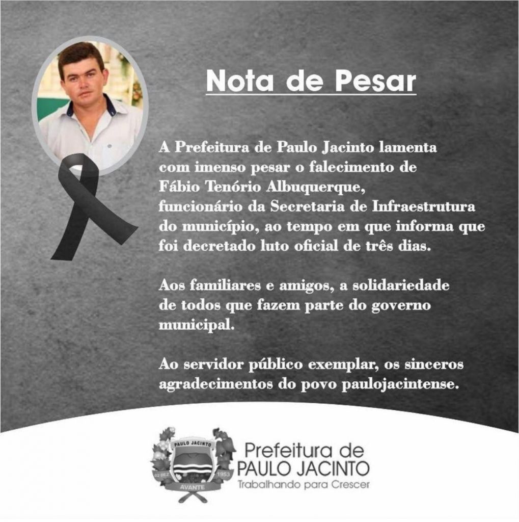 Fábio Tenório trabalhava na prefeitura de Paulo Jacinto, na Secretaria de Infraestrutura. Confira nota: