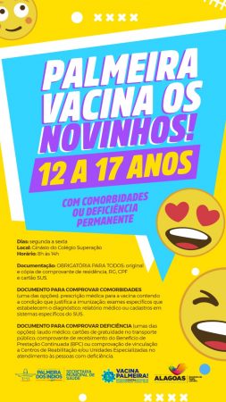 A vacinação contra a Covid-19 avançou em Palmeira dos Índios. Os jovens e adultos estão sendo imunizados e agora o município inicia uma nova etapa na imunização contra o vírus. A partir de amanhã (03), é iniciada a vacinação de adolescentes de 12 a 17 anos, com comorbidades.