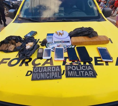 Com eles, foram apreendidos 1 kg de maconha, pedras de crack, munições, uma balança de precisão, além de sete aparelhos celulares sem nota fiscal.