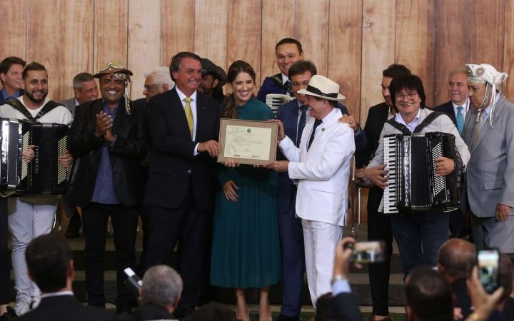 O presidente Jair Bolsonaro participou hoje (13) da cerimônia de reconhecimento do forró como patrimônio cultural do Brasil. O evento também foi realizado em homenagem póstuma ao cantor Luiz Gonzaga, o Rei do Baião, que faleceu em 1989 e completaria 109 anos.