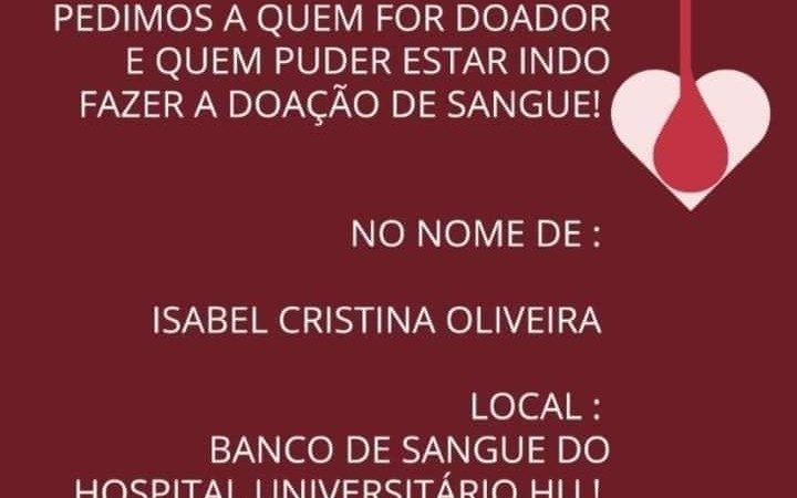 Familiares e amigos de Isabel Cristina Oliveira, internada no Hospital Universitário (HU), em Maceió, estão realizando uma campanha para arrecadação de qualquer tipo sanguíneo. A doação deve ser feita no banco de sangue do HU, no nome da paciente