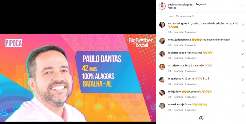 O pré-candidato ao Governo do Estado, Paulo Dantas. A paródia política foi postada nesta sexta no instagram do deputado. O político emedebista foi apresentado no formato de participantes do BBB real, que tiveram as identidades apresentados nesta sexta pela TV Globo.