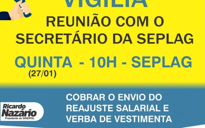 O Sindicato dos Policiais Civis de Alagoas (Sindpol/AL) convoca a categoria – ativos e aposentados – para uma vigília na Secretaria de Planejamento e Gestão (Seplag), nesta quinta-feira (27), às 10h.