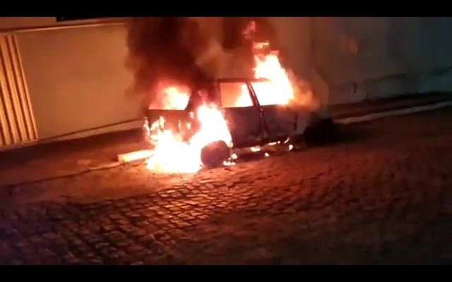 Um vídeo, compartilhado nas redes sociais, mostra o instante em que moradores se assustam com o carro incendiado.