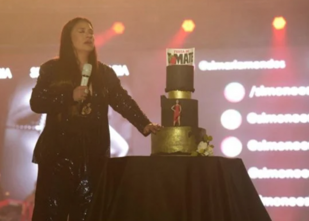 “Hoje é o dia oficial do aniversário dela. E nós gostaríamos de fazer uma homenagem pra ela. Traz o bolo da Simaria pra mim, vai”, pediu a cantora. Enquanto sua equipe trazia um bolo, que continha uma miniatura de Simaria de vestido vermelho, ela seguiu com o discurso e ficou emocionada.