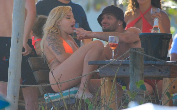 O ex-ginasta usava um chapéu preto e a mulher com quem estava acompanhado usava um biquíni laranja. Os dois aproveitaram a tarde ensolarada para tomar alguns drinks e trocar carinhos, como beijos e lambidas.
