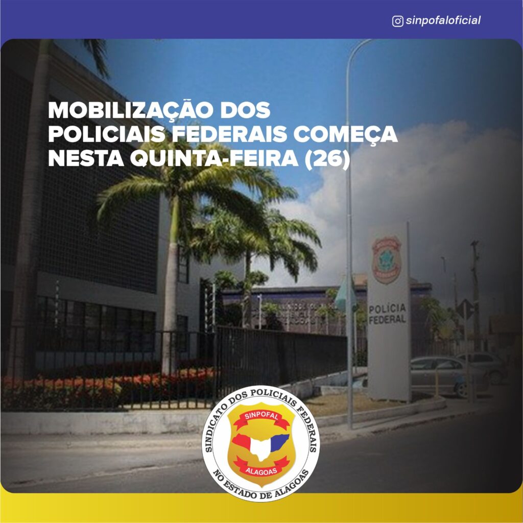 Os policiais federais da Superintendência Regional da Polícia Federal em Alagoas (SR/PF/AL) iniciam, nesta quinta-feira (26) a partir das 10 horas, mobilização nacional por reestruturação salarial. A mobilização em Alagoas, convocada pelo Sindicato dos Policiais Federias no Estado de Alagoas (Sinpofal), acontecerá em frente a superintendência na Avenida Walter Ananias, no bairro de Jaraguá.