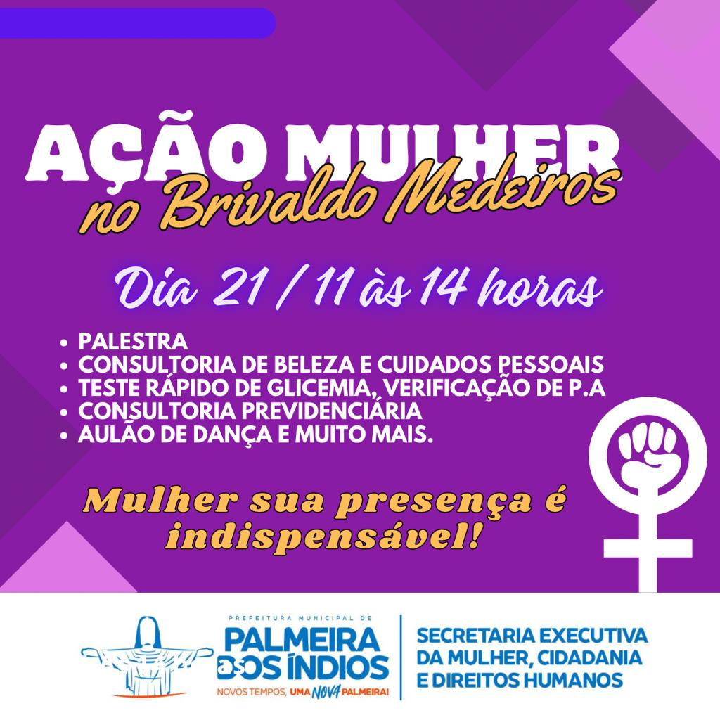No dia 21 deste mês de novembro, acontecerá no Conjunto Brivaldo Medeiros, em Palmeira dos Índios, a “Ação Mulher”.