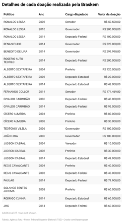 Entre 2004 e 2014, a petroquímica doou o total de R$ 2.994.693,26 às campanhas de 41 políticos alagoanos. No grupo dos beneficiados pela doações da Braskem estão presentes dois senadores eleitos, os atuais prefeito de Maceió e vice-governador de Alagoas, diversos deputados federais e estaduais, além de quatro ex-governadores, dois ex-senadores e um ex-prefeito da capital.