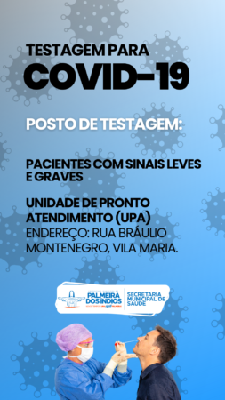 A Secretaria de Saúde (SMS) de Palmeira dos Índios informa que a Unidade de Pronto Atendimento (UPA) é o ponto de testagem contra a Covid-19 no município.
