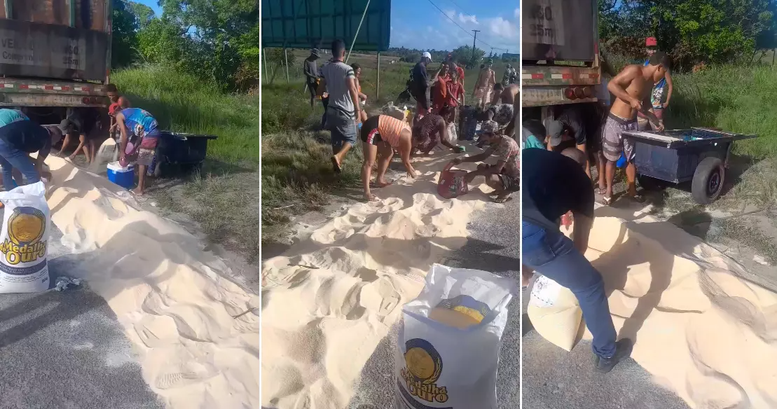 Populares que testemunharam o ocorrido aproveitaram a situação e começaram a recolher parte da carga derramada. Usando depósitos plásticos, sacolas de supermercado, garrafas pets, caixas térmicas, sacas e até um carrinho de mão, eles se mobilizaram para recolher o açúcar.