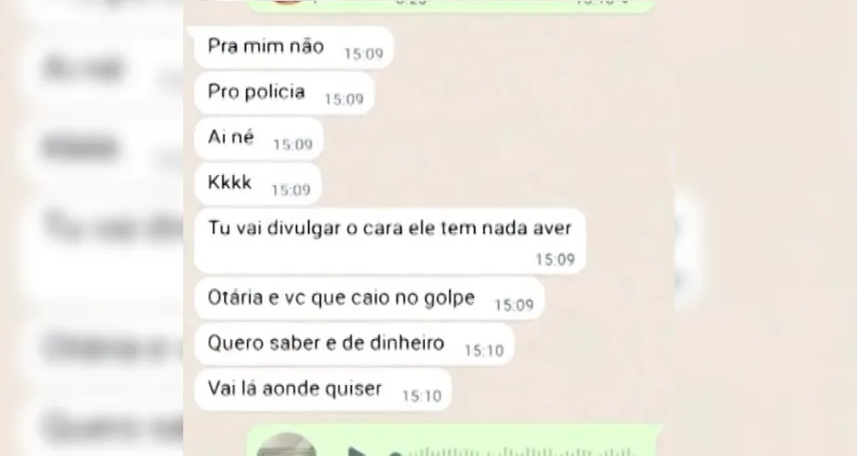 “Tu vai divulgar o cara. Ele não tem nada a ver”, diz o golpista, que acrescenta: “Otária é você que caiu no golpe. Quero saber é de dinheiro. Vai lá aonde quiser”, finaliza.
