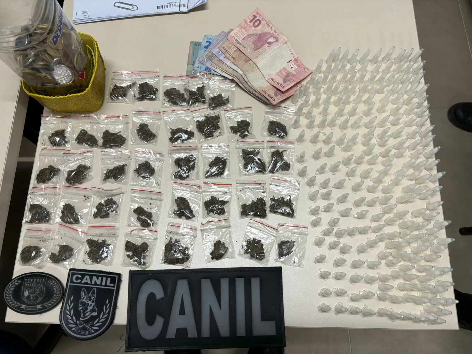 É da PM a informação de que ao ser abordado, o suspeito estaria com uma pequena quantidade de drogas, mas confessou que possuía mais material ilícito na sua casa. No local foram apreendidos 233 pinos de cocaína, 37 bombinhas de maconha, R$ 123,00.