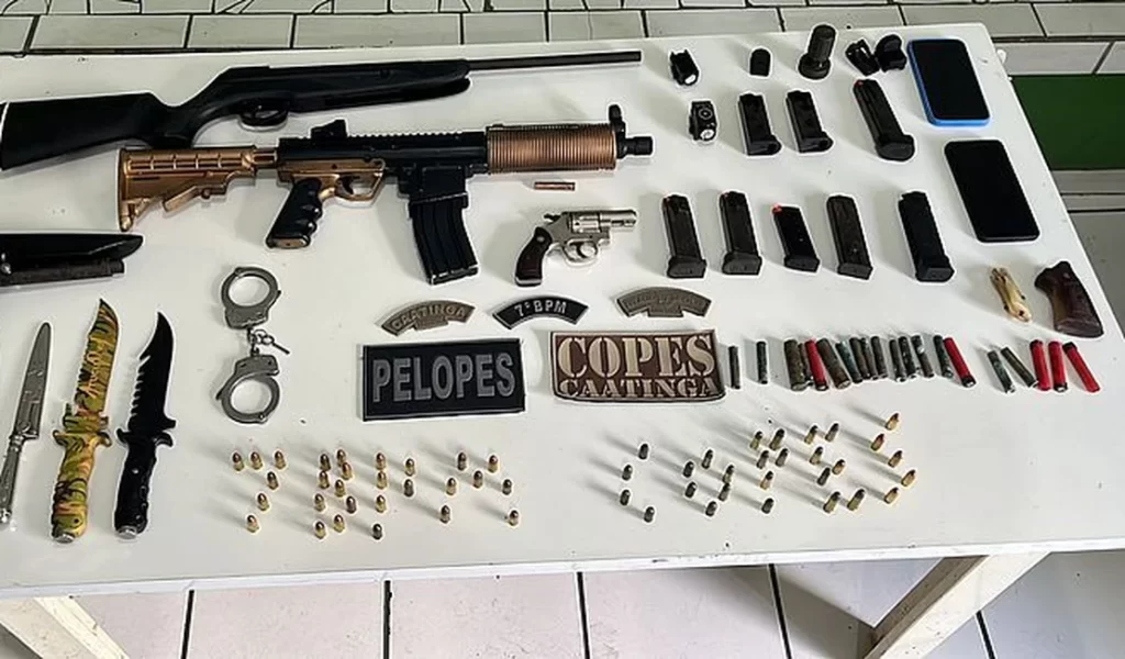 Ao todo, foram apreendidos oito carregadores de pistola, um revólver de calibre 32, 56 munições intactas e seis deflagradas, dois celulares, uma algema, facas táticas, materiais para manutenção de armas, lanternas táticas, um fuzil airsoft, uma espingarda e seis caixas vazias de armas.