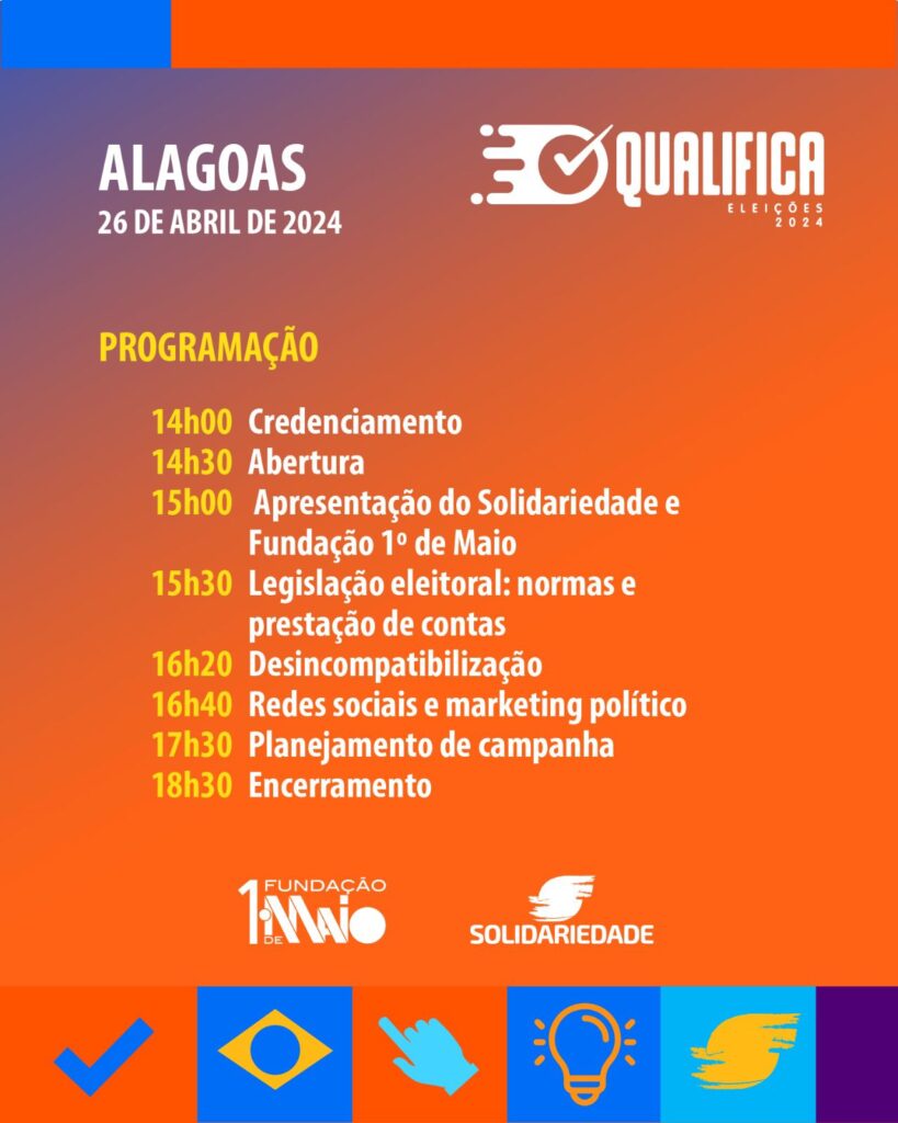 Acontece nesta sexta-feira (26) o curso de qualificação para os pré-candidatos do partido Solidariedade em Alagoas. O QUALIFICA reunirá, a partir das 14h, no hotel Intercity, em Maceió, um time de especialistas com ampla experiência em gerenciamento de campanha. O evento será realizado pela Fundação 1º de Maio