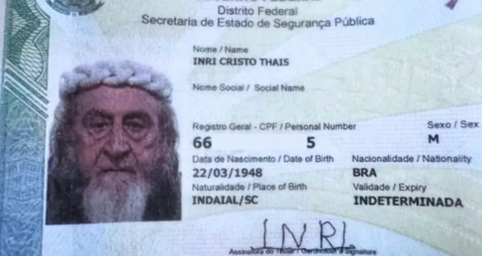 Na nova carteira de identidade, o líder religioso assina como “Inri” e aparece com uma coroa de espinhos de plástico na foto três por quatro. Como ele tem mais de 65 anos, o documento não possui prazo para expirar.