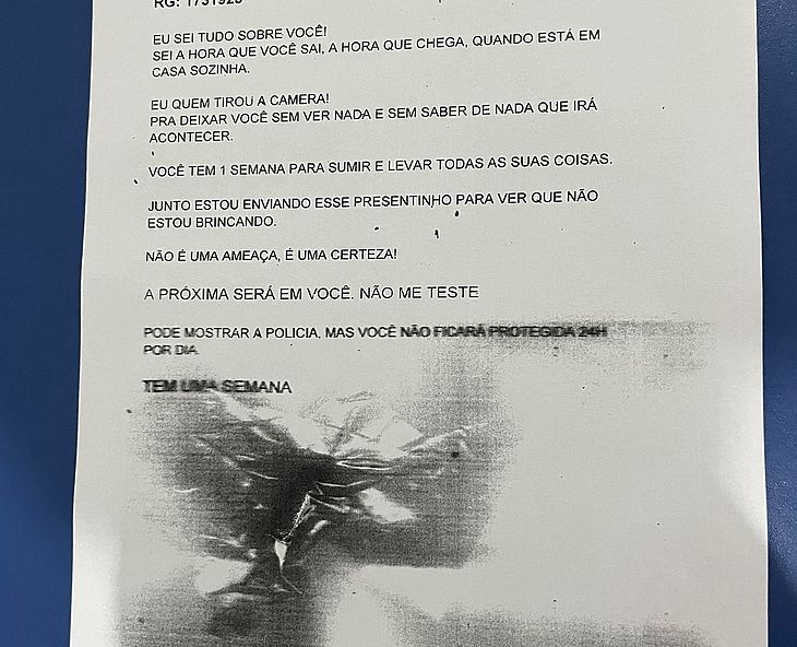 “Eu sei tudo sobre você. Eu sei o horário que você sai, que chega e quando está em casa sozinha. Foi eu quem tirou a câmera, para deixar você sem ver nada e sem saber de nada que vai acontecer. Você tem 1 semana para sumir e levar todas as suas coisas. Junto ao bilhete, estou enviando esse presentinho para você ver que eu não estou brincando. Não é uma ameaça, é uma certeza. A próxima será em você, não me teste. Pode mostrar a polícia, mas você não ficará protegida 24 horas por dia”, diz a mensagem.