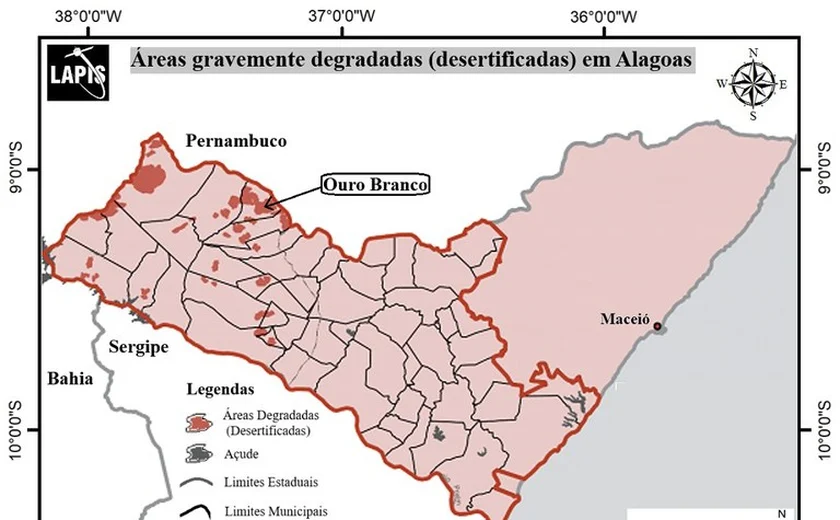 O Laboratório de Análise e Processamento de Imagens de Satélites da Universidade Federal de Alagoas (Lapis/Ufal) divulgou recentemente um mapeamento atualizado da situação da desertificação no estado alagoano. De acordo com o estudo, baseado em dados de satélites, os municípios de Ouro Branco, Maravilha e Mata Grande são os que possuem maiores áreas desertificadas.