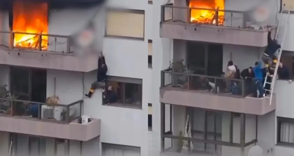 Pouco depois, um grupo de pessoas consegue colocar uma escada na direção da criança. Nesse momento, o homem parece rasgar uma tela de proteção da sacada e resgatar o garoto.
