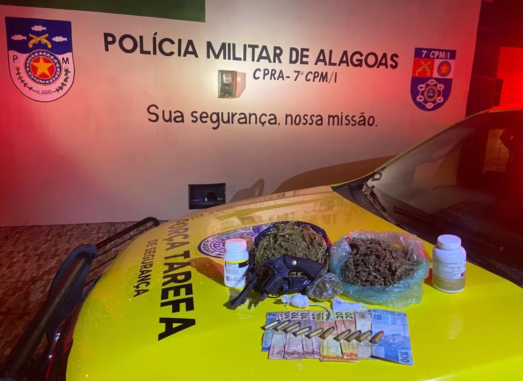 Em Girau do Ponciano, militares da 7ª Companhia de Polícia Militar Independente (CPM/I) detiveram um homem de 25 anos de idade. Com ele, foram apreendidos os seguintes itens: um revólver calibre 38 com 10 munições intactas, aproximadamente meio quilo de maconha, cerca de 10 gramas de crack, R$312 em espécie e uma folha de papel com anotações indicando venda de drogas.