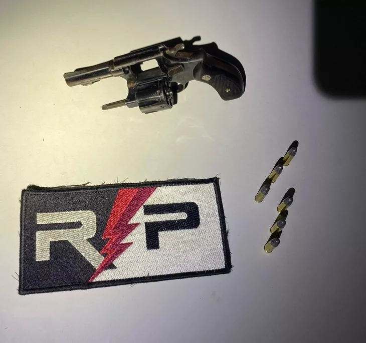 Diante da situação, a guarnição foi até o local e flagrou um dos homens em posse de uma arma de fogo no terreno. Ele foi detido e, com ele, um revólver calibre 32 foi apreendido, com seis munições.