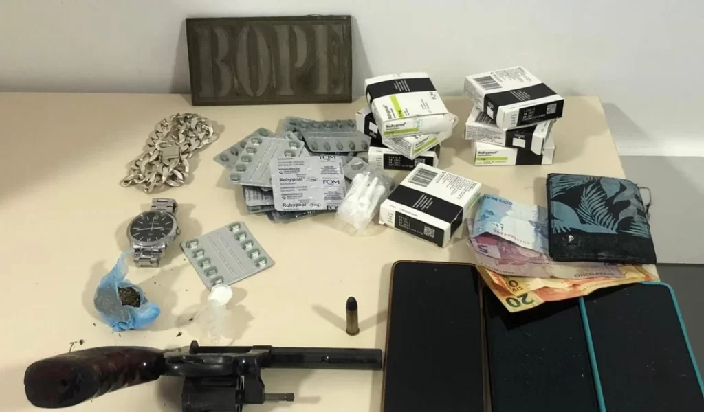 Durante o cumprimento dos mandados, as equipes apreenderam dois revólveres calibre 38, além de maconha, 41 caixas de Rohypnol, aparelhos celulares e munições. Duas pessoas foram presas e encaminhadas à Central de Flagrantes.