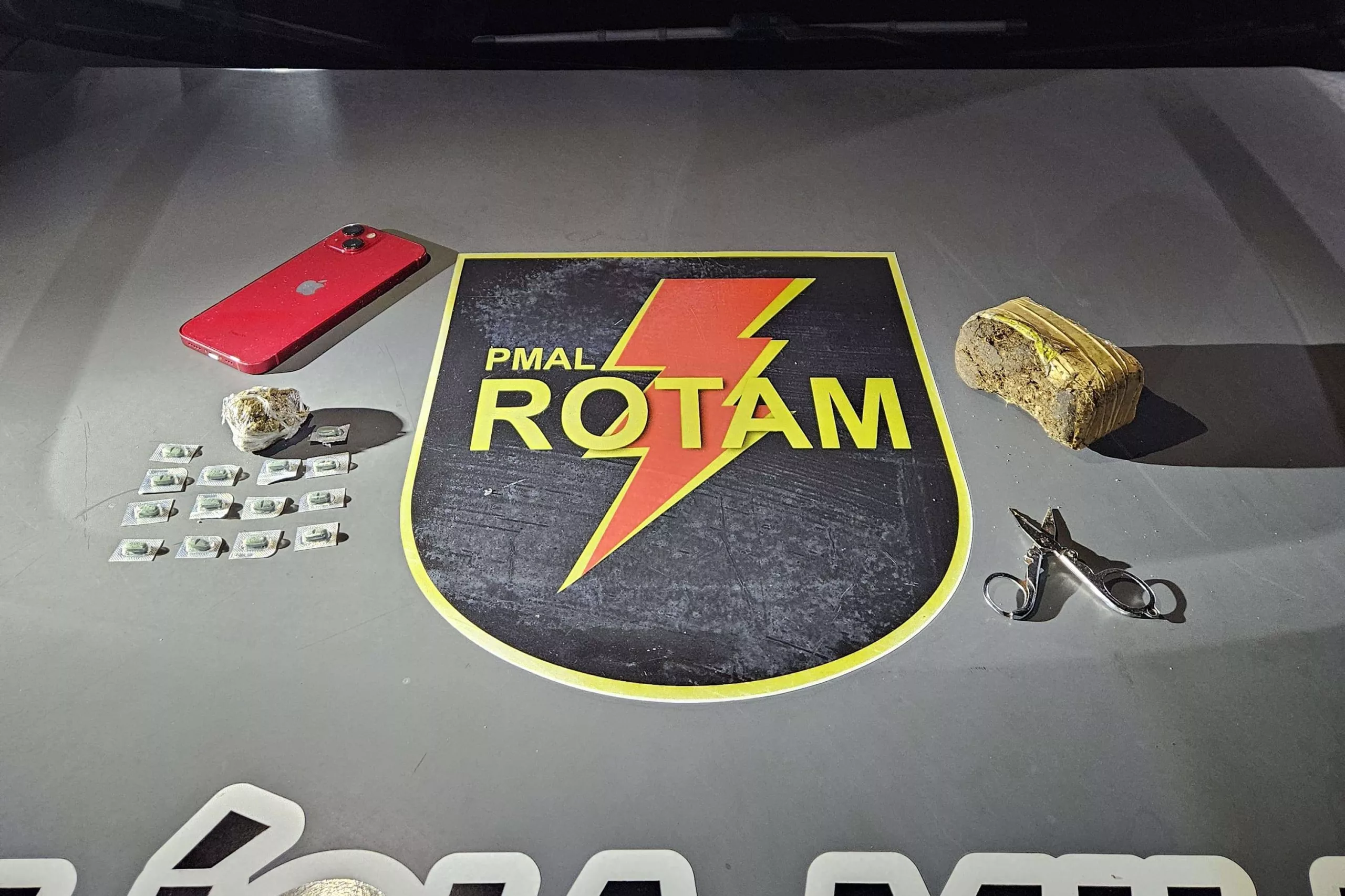 O Batalhão de Polícia Militar de ROTAM no começo da noite de quinta-feira (30), por volta de 18h na região do Marco dos Corais, na Orla de Ponta Verde, na capital. Um indivíduo de 18 anos foi detido por tráfico de drogas após abordagem. Com ele foram apreendidos 100 gramas de maconha e 14 comprimidos de medicamento com efeito alucinógeno (popularmente conhecido como rohypnol), além de uma tesoura e um aparelho celular. A atuação da ROTAM também contou com o apoio de agentes de proximidade do Programa Ronda no Bairro.