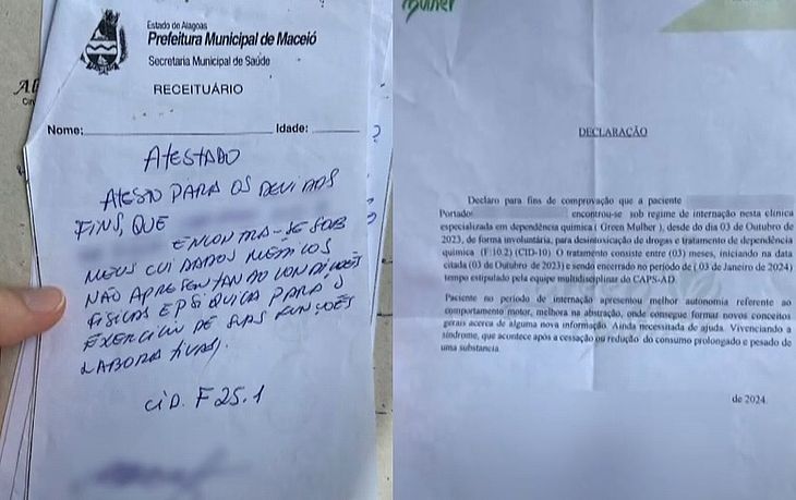 A declaração assinada por uma assistente social da clínica feminina para pessoas com dependência química, no município de Satuba, mostra que a vítima havia sido internada de forma involuntária em outubro do ano passado, para desintoxicação de drogas e para o devido tratamento. No mesmo documento, a assistente social afirma que a idosa apresentou melhoras no comportamento, mas sem especificar qual tipo de apoio ela precisava à época. O documento foi assinado pela profissional em abril deste ano.