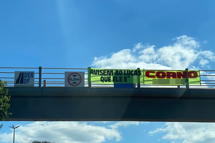 Uma faixa instalada em uma passarela do Pistão Sul, em Taguatinga, chamou a atenção de quem trafegava pela via na manhã desta segunda-feira (24). O banner apresentava uma mensagem inusitada, acompanhada de um número de telefone. O texto dizia, em letras maiúsculas: “Avisem ao Lucas que ele é corno”.
