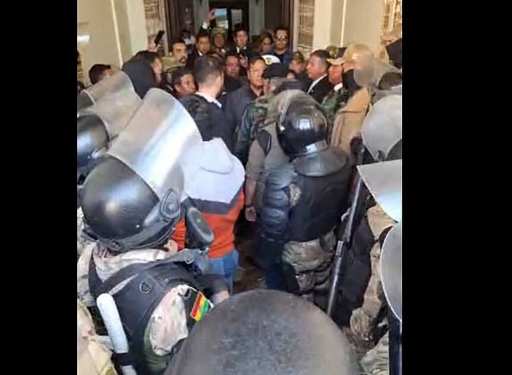 Vídeos que circulam na internet mostram um blindado do Exército se chocando contra a entrada do palácio presidencial e soldados entrando no prédio. Antes disso, tropas foram vistas marchando pelas ruas da capital. De acordo com a agência de notícias Reuters, Arce disse que exigiu que as tropas sejam desmobilizadas.