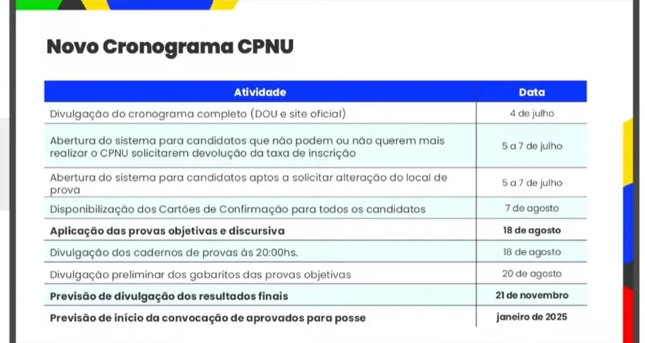 Conforme o cronograma atualizado, a lista final de aprovados no CNU será divulgada no dia 21 de novembro. Já a convocação para posse deve começar em janeiro de 2025.