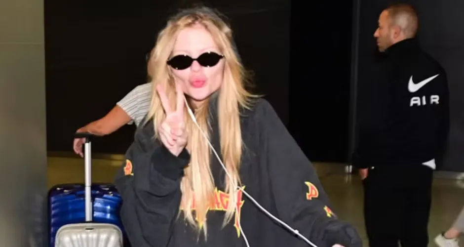A artista mostrou simpatia ao sorrir para a câmera e fazer um sinal de paz para o paparazzo. Ela estava vestida com um look oversized, composto por uma calça jeans larga, um moletom preto de capuz e óculos escuros.