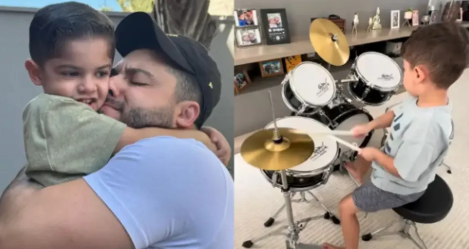O cantor Murilo Huff, 28, mostrou o filho dele, Léo, 4, aprendendo a tocar bateria na segunda-feira (5). O menino, que também é filho da cantora Marília Mendonça (1995-2021), foi instruído pelo próprio pai enquanto era filmado.