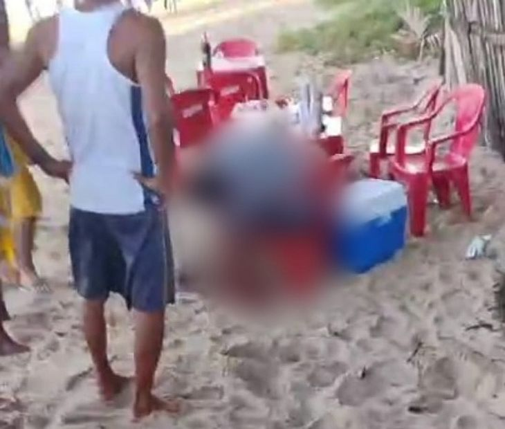 A dupla saiu em uma moto e depois voltaram para atirar no homem. Ele morreu sentado na cadeira do bar, na areia da praia. Imagens do local mostram a vítima ensanguentada.