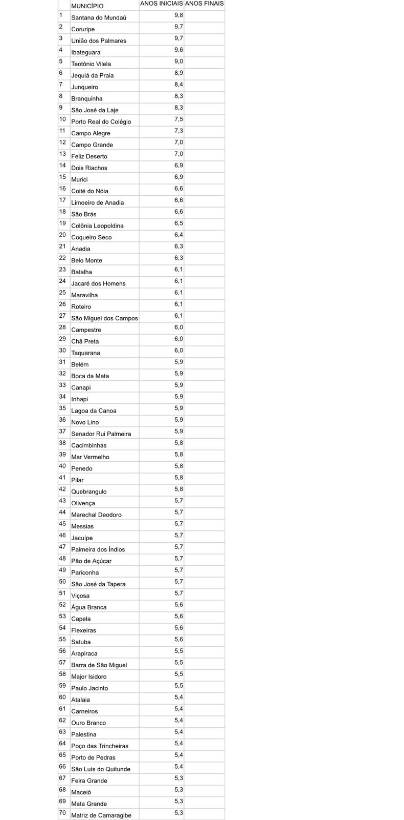 Na avaliação das séries finais Minador do Negrão ficou em 98• e Estrela de Alagoas 92•, nas séries iniciais o resultado foi ainda pior : Estrela de Alagoas foi o penúltimo (99•) e Minador do Negrão o último (100•) dentre os cem municípios avaliados