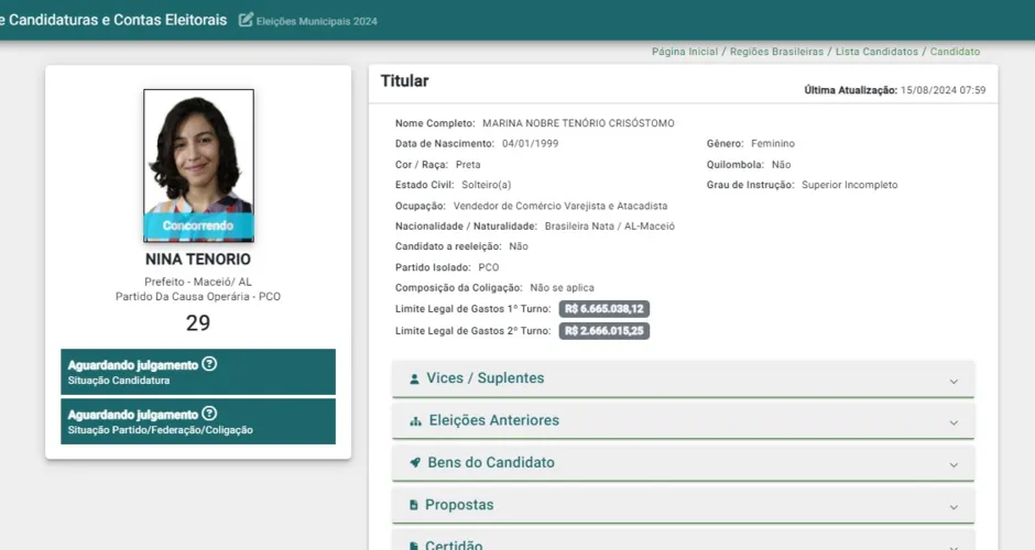 A presidente do diretório municipal do Partido da Causa Operária (PCO) na capital, Marina Nobre Tenório Crisóstomo, vai disputar a Prefeitura de Maceió nas eleições deste ano. A candidatura de Nina Tenório, como prefere ser chamada, foi registrada na plataforma de dados da Justiça Eleitoral e é a sexta na lista de concorrentes.