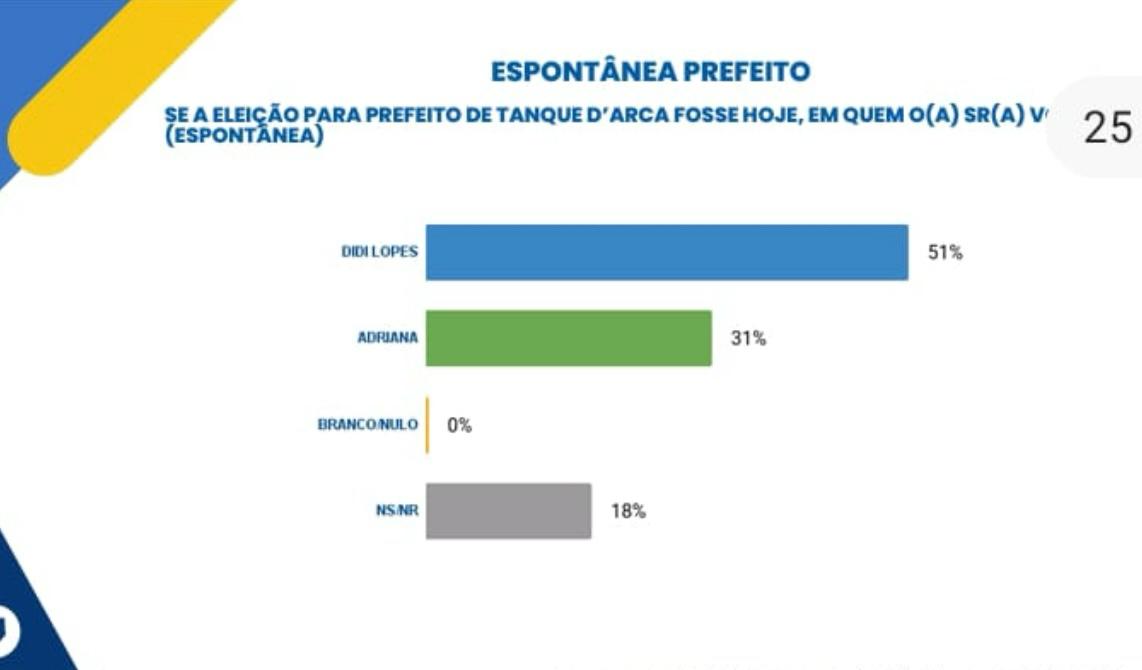 Na pesquisa anterior, realizada em julho de 2024, Didi Lopes tinha 50% das intenções de voto. Agora ele cresceu e está com 55%. O segundo lugar, Adriana Wanderley, tinha apenas 35% e caiu para 34%. Brancos e nulos somaram 3%, e que não opinaram 9%.