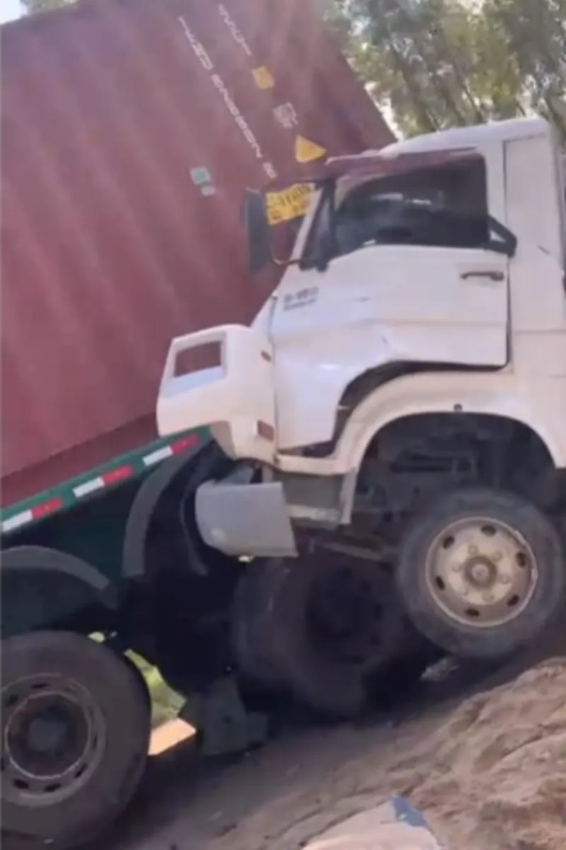 Imagens do local mostram que o caminhão colidiu na traseira da carreta. O primeiro veículo ficou com a cabine totalmente destruída.