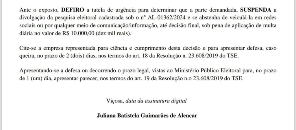 Na pesquisa foram encontrados indícios de irregularidades em vários aspectos. Ficou então determinado que em caráter de urgência “suspenda a divulgação da pesquisa eleitoral cadastrada sob número AL – 01362/2024 e se abstenha de veiculá-la em redes sociais ou por qualquer meio de comunicação/informação, até decisão final, sob pena de aplicação de multa diária no valor de R$ 10.000,00 (dez mil reais)”.
