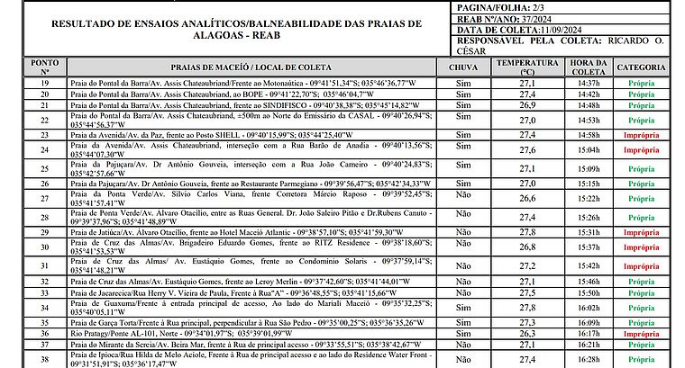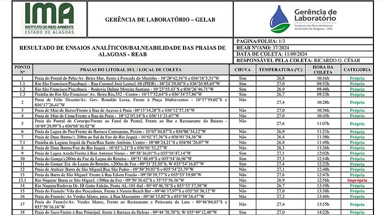 O relatório de balneabilidade das praias, divulgados pelo Instituto de Meio Ambiente de Alagoas (IMA), nesta sexta-feira, 13, aponta que 8 trechos de toda costa alagoana estão impróprios para banho. A coleta das águas foi realizada por peritos do IMA entre a terça, 10, e a quarta-feira, 11. O aniversário dos 207 anos da Emancipação Política de Alagoas cai na segunda-feira, proporcionando o feriadão no estado.