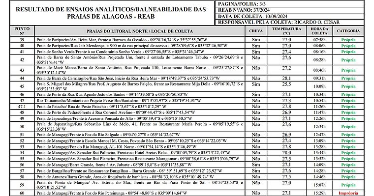 Litoral Norte de Alagoas: 1 trecho impróprio
