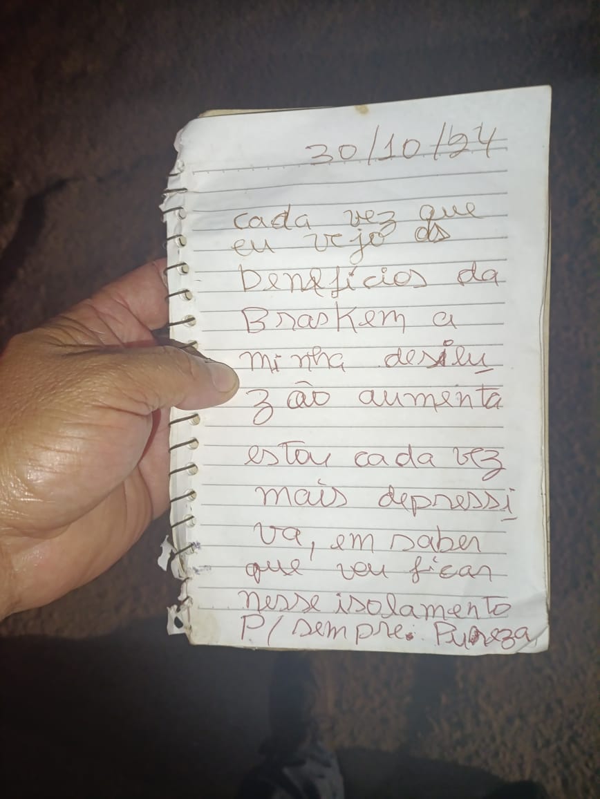 “Cada vez que eu vejo os benefícios da Braskem, a minha desilusão aumenta. Estou cada vez mais depressiva, em saber que vou ficar nesse isolamento para sempre. Pureza”. Foi esse o bilhete que a dona de casa deixou escrito com letra do próprio punho em uma folha de papel pautado, com data do dia 30 de outubro de 2024. O bilhete foi achado pelos vizinhos e colocado nas mídias sociais, com sinal de luto e protesto por mais uma vida ceifada, entre as vítimas da mineração em Maceió.