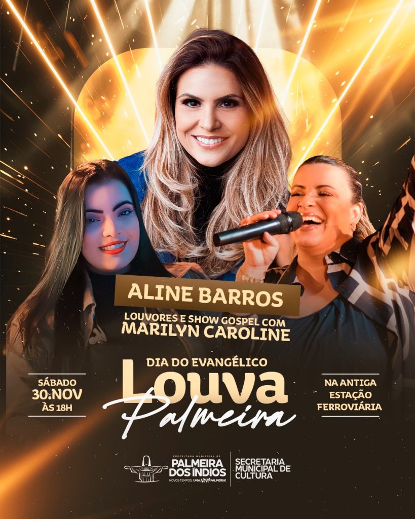 A Antiga Estação Ferroviária receberá neste sábado (30), a partie das 17h30, o Louva Palmeira 2024, em comemoração ao Dia do Evangélico, feriado estadual. Esta edição, promovida pela Associação de Pastores de Palmeira dos Índios (Apepi), em parceria com a Associação de Ministros e Pastores (Ampepi), e o apoio cultural da Prefeitura de Palmeira dos Índios, contará com uma programação especial que trará as cantoras gospel Aline Kistenmacker Barros dos Santos, a Aline Barros, a palmeirense Marilyn Caroline e Jade Ferreira.