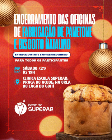 O Instituto Superar realizará o encerramento das oficinas de fabricação de panetone e biscoitos natalinos e faz um convite especial a toda população. O evento ocorrerá nesse próximo sábado, 21 de dezembro, a partir das 19h, na clínica Escola Superar, localizada na Praça Moreno Brandão (Praça do Açude), na Orla do Lago do Goiti.