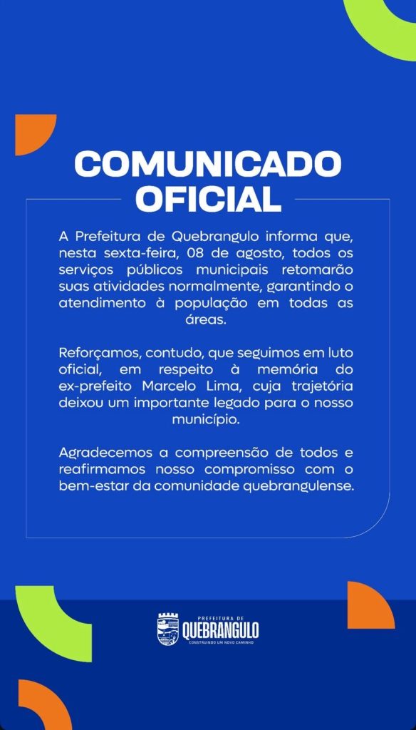 Apesar da retomada dos serviços, o município segue em luto oficial, em respeito à memória do ex-prefeito Marcelo Lima, cuja contribuição política e social deixou um legado significativo para Quebrangulo.