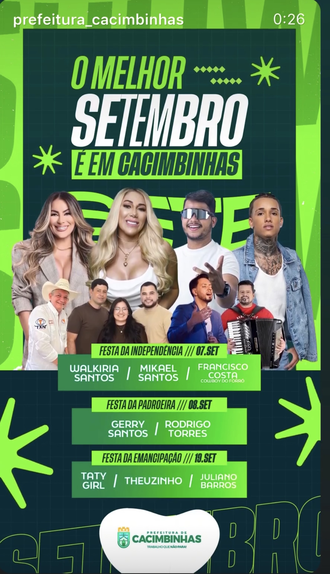 Além de celebrar a independência do Brasil, o evento marca o início das comemorações pela emancipação política de Cacimbinhas, que completa mais um ano de história no próximo 19 de setembro. Para essa ocasião especial, a festa será animada por Taty Girl, Theuzinho e Juliano Barros.