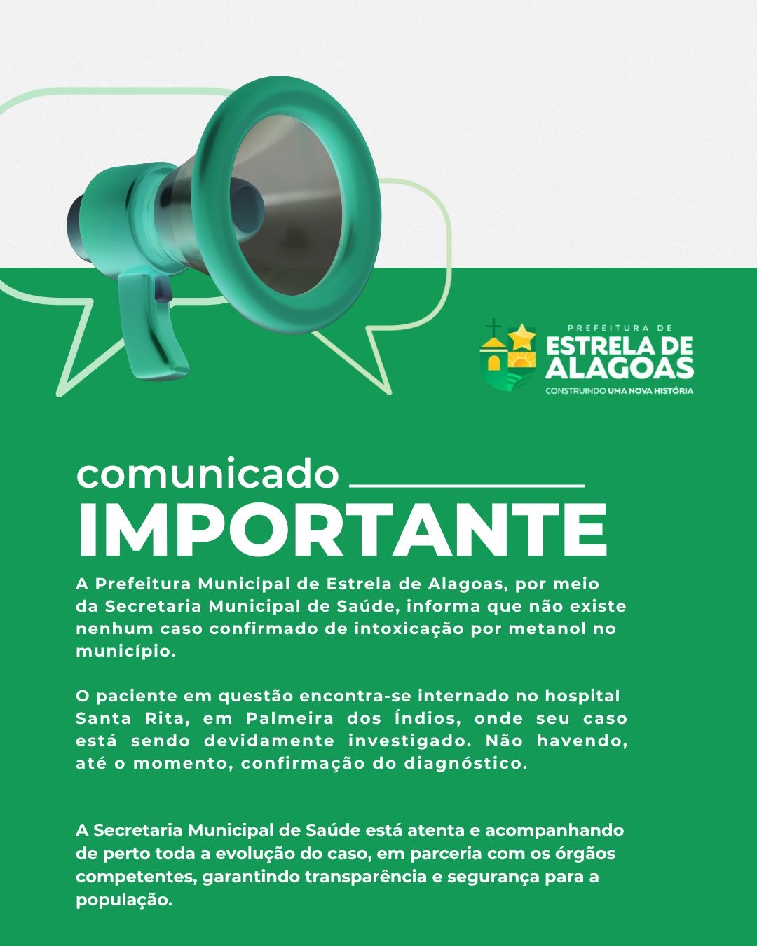 A Prefeitura de Estrela de Alagoas, por meio da Secretaria Municipal de Saúde, informou que não há casos confirmados de intoxicação por metanol no município.