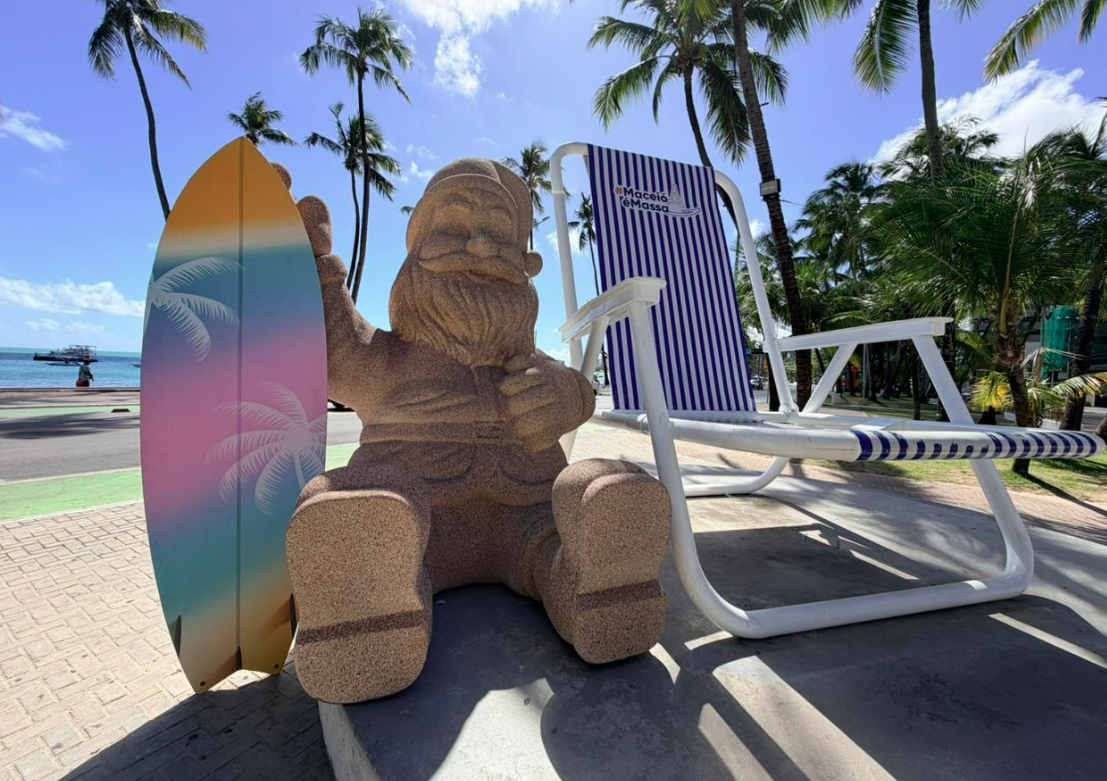 A Cadeira Gigante, um dos símbolos turísticos mais fotografados de Maceió, ganhou um novo parceiro para o período natalino: um Papai Noel tropical de três metros de altura, produzido em fibra com texturização de areia e segurando uma prancha de madeira.